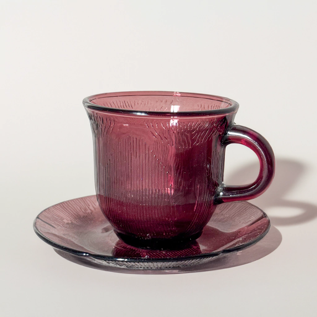 Juego de té vintage compuesto por 4 tazas con sus 4 platitos, en un delicado color uva traslúcido y textura que resalta su encanto retro. Se encuentra en perfecto estado, sin defectos.